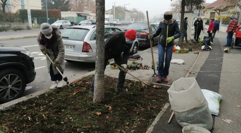 Nous avons mené une opération de fleurissement de pieds d’arbres avenue Paul Santy, ainsi que 2 MIF rue général Frère. C’est une opération d’embellissement mais pas de plantation de plantes comestibles (à l’exception de thym). Pour cela, il faudrait mener une analyse de la terre pour s’assurer qu’elle est compatible avec des plantations comestibles.