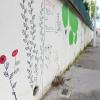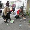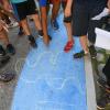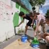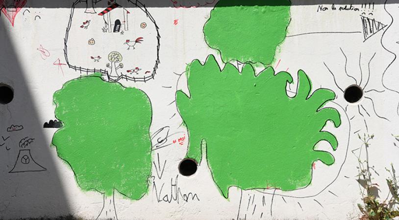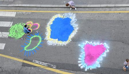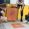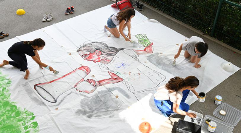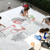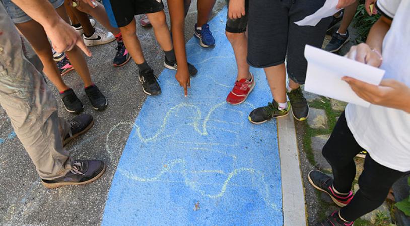 Nouvelle étape, la réalisation de la fresque au sol. Tania dessine les contours, les enfants appliquent les couleurs. L’œuvre prend petit à petit forme. Bombes de pigments à la main, bleu cobalt, rose indien, vert pomme..., ils transforment le gris du bitume en paysage onirique.