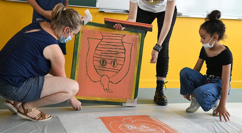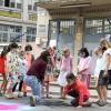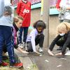 Sagement assis sur les marches devant l’école Jean Gerson, les élèves de CE1 et CE2 écoutent attentivement les instructions données par leur enseignante Anne-Laure Bert et par Tania Rodriguez, jeune artiste d'origine mexico-équatorienne. Tout le monde a son rôle à jouer, l'espace piétonnisé s'offre à eux pour concrétiser leur projet artistique.