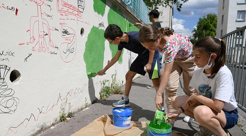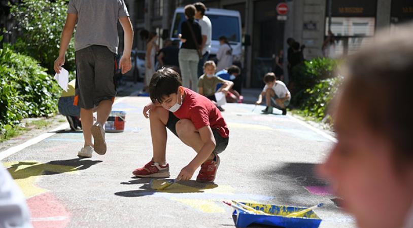 Pour faire plus de place aux enfants, la Ville de Lyon a engagé une mesure centrale : celle de l’apaisement des abords des écoles et des crèches, notamment avec la sécurisation et la piétonnisation des espaces publics. L’objectif est de permettre aux enfants de se réapproprier leur ville grâce à la pratique artistique notamment.