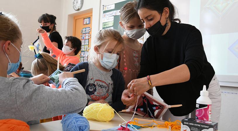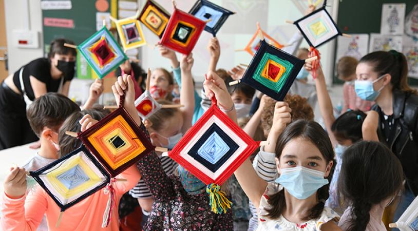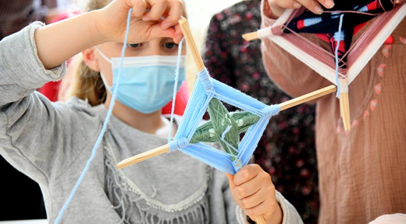 Ils ont aussi confectionné des "Ojos de dios". Au Mexique, cet objet artisanal en forme de losange tissé de fils de laine protège les nouveaux-nés jusqu’à leur 5 ans (représentation des 5 points cardinaux, nord, sud, est, ouest et centre). Comme les autres, Arthur est fier de son travail : "Tu veux que je t'explique comment on fait ? On a pas besoin de beaucoup de matériel, que 2 bâtons de même taille et de la laine." Ils seront tous installés sur les grilles de l'école.