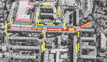Ce nouveau plan de circulation accompagne l'ouverture à la circulation de la nouvelle voie de Narvik qui est aménagée en zone de rencontre : priorité aux piétons et vitesse limitée à 20 km/h.