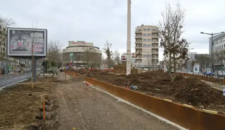 Au total, 101 arbres sont en cours de plantation, accompagnés de massifs arbustifs, de bandes fleuries et de haies, composant ainsi une trame végétale riche et diversifiée. Des dispositifs de gestion des eaux pluviales sont également prévus pour une meilleure infiltration dans le sol.