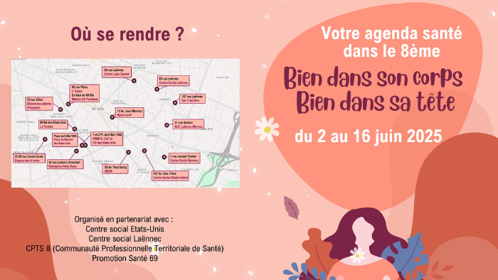 Cet événement est organisé par le Conseil Local de Santé Mentale et l’Atelier Santé Ville de Lyon 8e, en partenariat avec le Centre social Etats-Unis, le Centre social Laënnec, la CPTS 8 (Communauté Professionnelle Territoriale de Santé), Promotion Santé 69 et la Mairie du 8e.