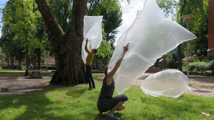 À partir de la rencontre incongrue avec des objets aériens indéterminés, venez faire l’expérience ludique des Flottants. Manipuler l’air ? Oui, c’est possible. On lui fabrique une enveloppe puis on l’anime, seul ou à plusieurs pour éprouver la gravité d’une masse. À moins qu’il ne soit déjà en infime mouvement ?