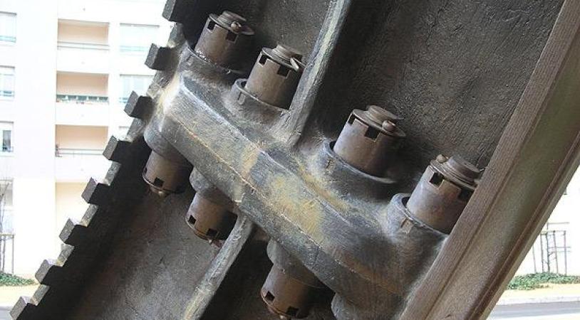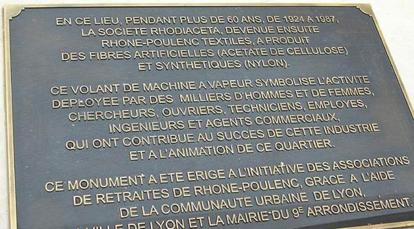 Sauvé de la démolition en 1986, ce volant d'inertie a été érigé le 15 juin 2004 à l'initiative de l'ARARP (Association Régionale des Anciens de Rhône-Poulenc) en lieu et place du coeur de l'ancienne usine Rhodiacéta.