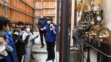 Des enfants de l'école primaire Gerson (Lyon 5e) ont pu découvrir en avant-première l'Horloge Charvet, dite "Horloge aux guignols" restaurée.