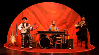 Dans un décor rouge cabaret, trois personnages nous entraînent dans l’univers de Monsieur K...