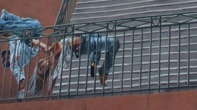 Deux personnages insolites étudient le voisin du dessus, le voisin du dessous, le voisin d’en face, le voisin d’à côté.