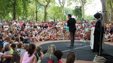 Deux dimanches de juillet, un pont suspendu, une île et ses insulaires en fête autour d'un spectacle de rue ou d'un concert pieds dans l'herbe.